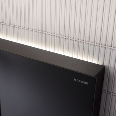 - En smart lyskilde kan integreres smart i skyllet. Geberit betjeningsplader har mange smarte funktioner. Blandt andet Geberit DuoFresh modulet, der automatisk tænder LED-orienteringslys om natten. En nærhedssensor aktiverer lyset og slukker det automatisk igen. Lyset og styrken kan justeres via Geberit Home App.